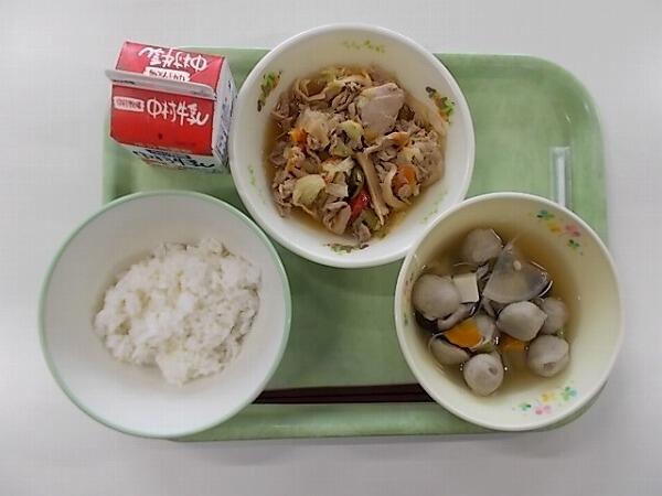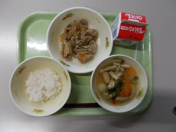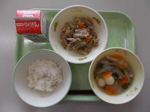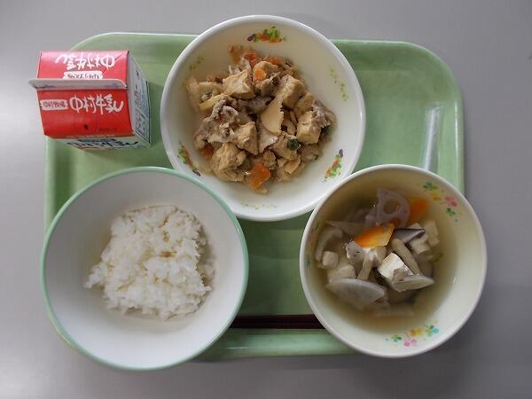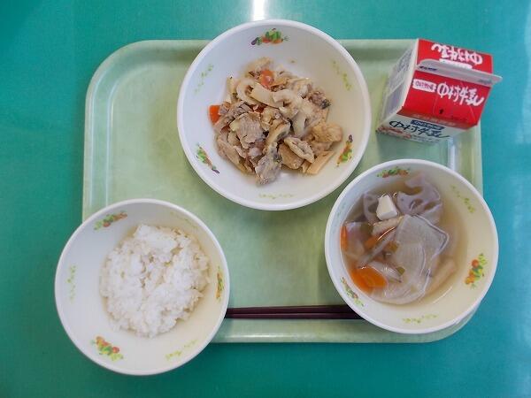 小学部の献立は「麦ご飯、根菜汁、豚肉のごま味噌炒め」でした。