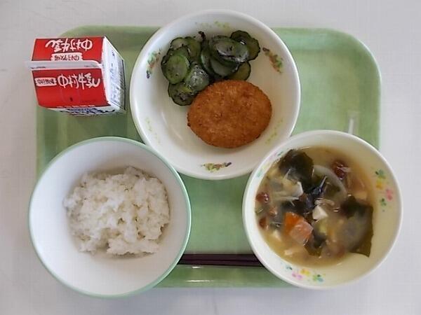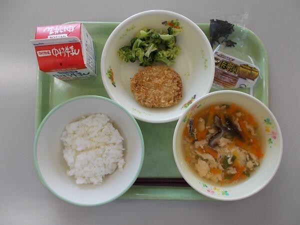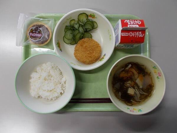 小学部の献立は「麦ご飯、なめこの味噌汁、牛肉コロッケ、ゆかり和え」でした。