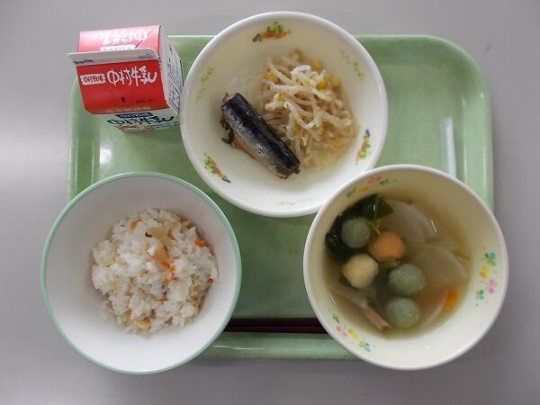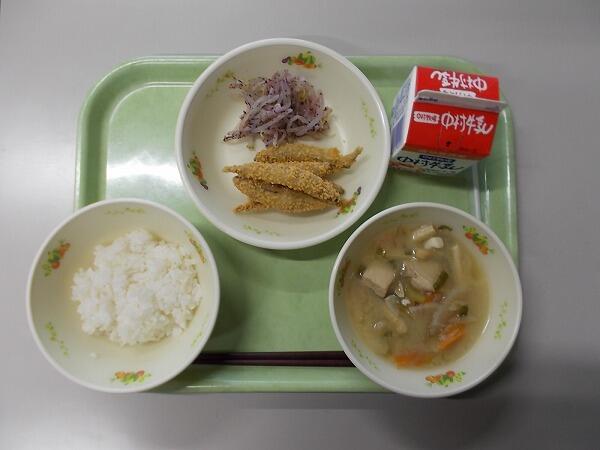 小学部の献立は「麦ごはん、さつま汁、きびなごのカリカリフライ、もやしのゆかり和え」でした。