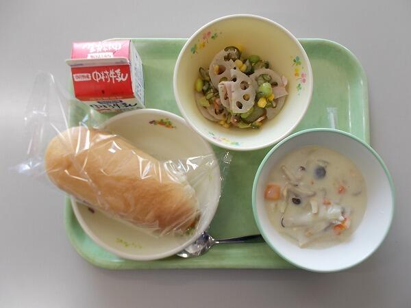 小学部の献立は「食パン、野菜スープ、ハンバーグのキノコソース、黒豆きなこクリーム」でした。