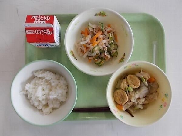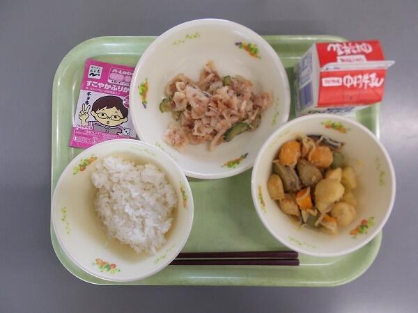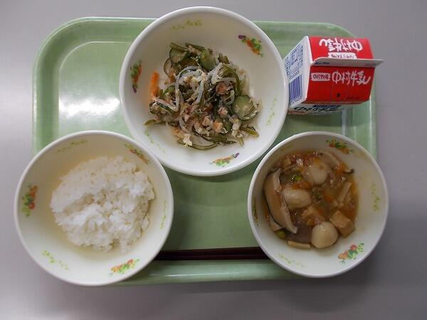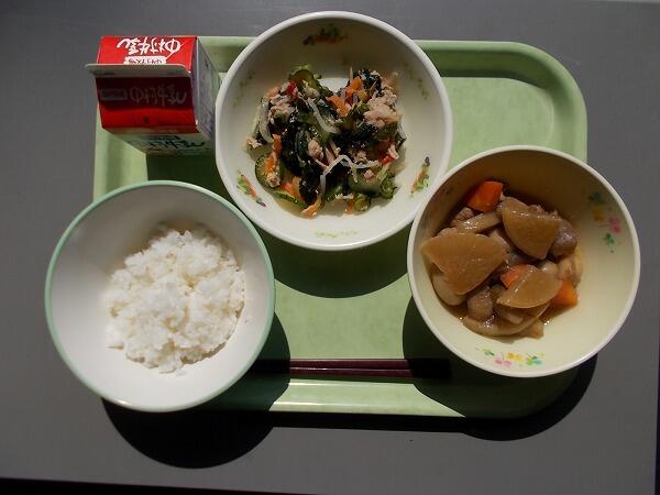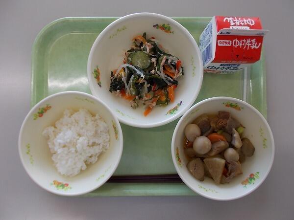 小学部の献立は「麦ごはん、さといものそぼろ煮、茎わかめの酢の物」でした。