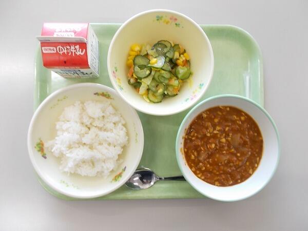 小学部の献立は「麦ご飯、キーマカレー、コーンサラダ」でした。