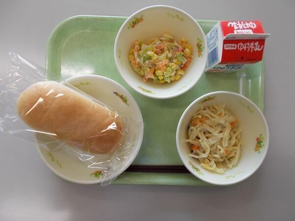 小学部の献立は「コッペパン、マカロニのクリーム煮、じゃこサラダ」でした。