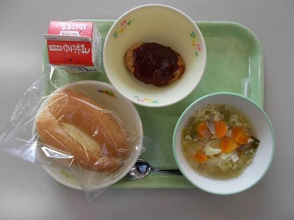 小学部の献立は「マヨネーズパン、マカロニスープ、トマトソースハンバーグ」でした。