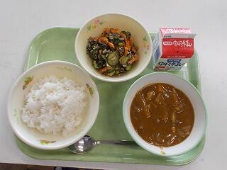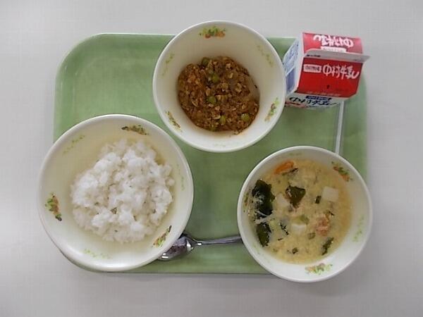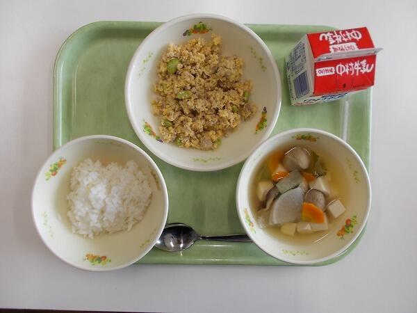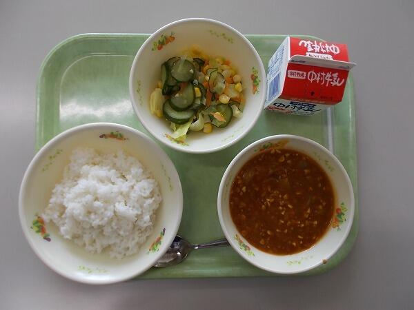 小学部の献立は「麦ごはん、かきたま汁、ドライカレー」でした。