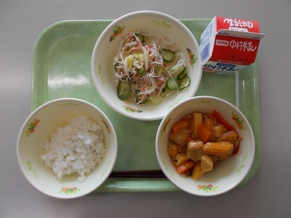 小学部の献立は「麦ごはん、肉団子の甘酢煮、ビーフンの中華和え」でした。