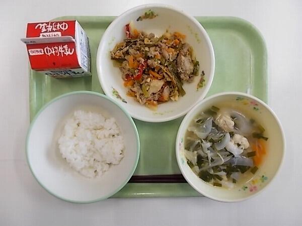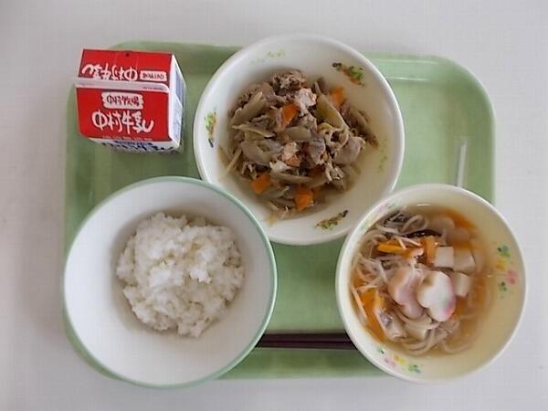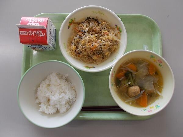 小学部の献立は「麦ご飯、中華肉団子スープ、チャプチェ」でした。