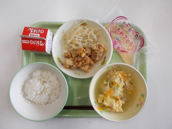 中学部はお楽しみ献立で「減量麦ご飯、かき玉野菜スープ、塩から揚げ(ゆでもやし)、お祝いイチゴクレープ」でした。