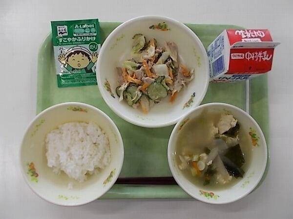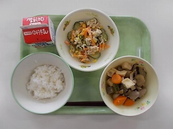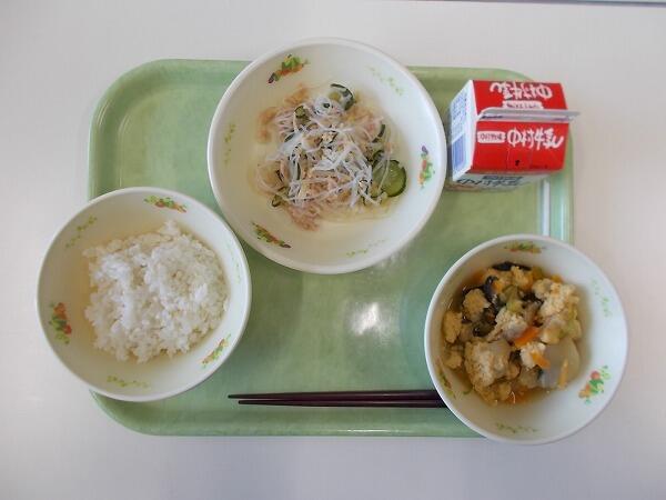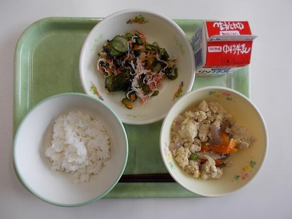 中学部の献立は「麦ご飯、とふの粉の煮物、きゅうりとわかめの酢の物」でした。