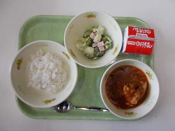 小各部の献立は「麦ごはん、ポークハヤシライス、ブロッコリーのサラダ」でした。