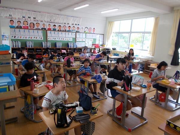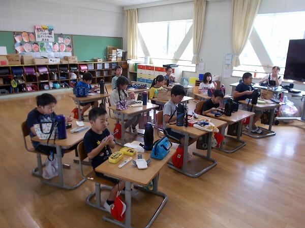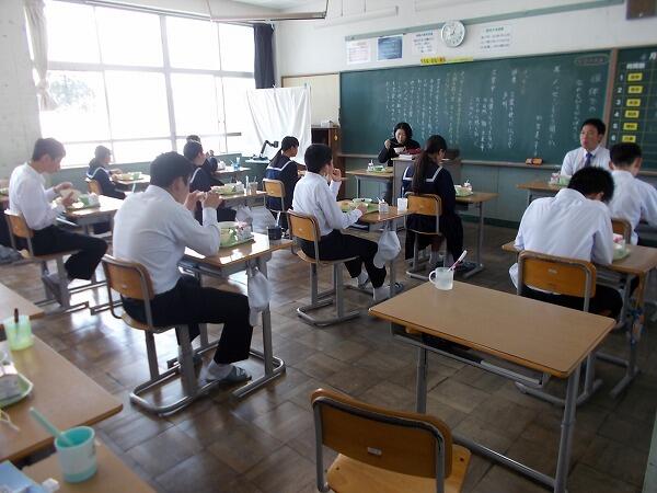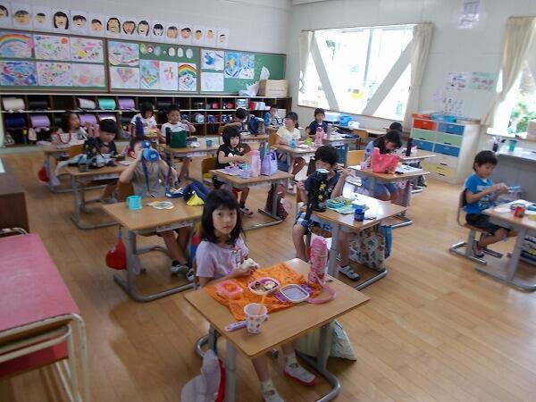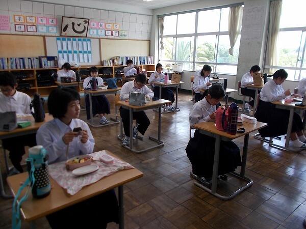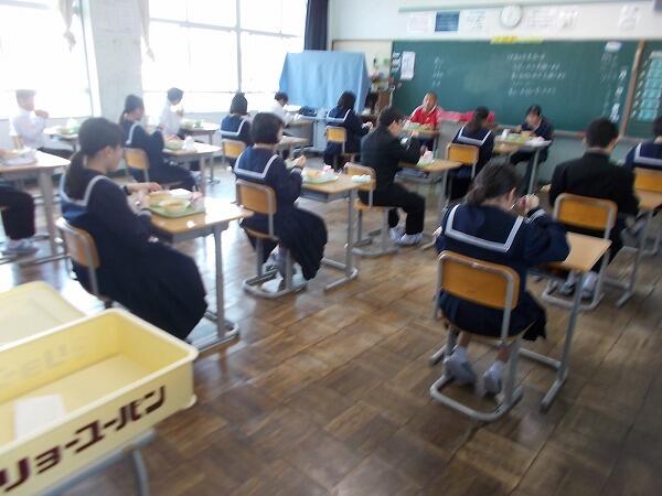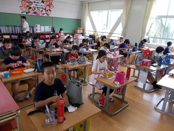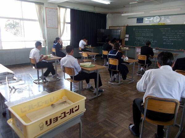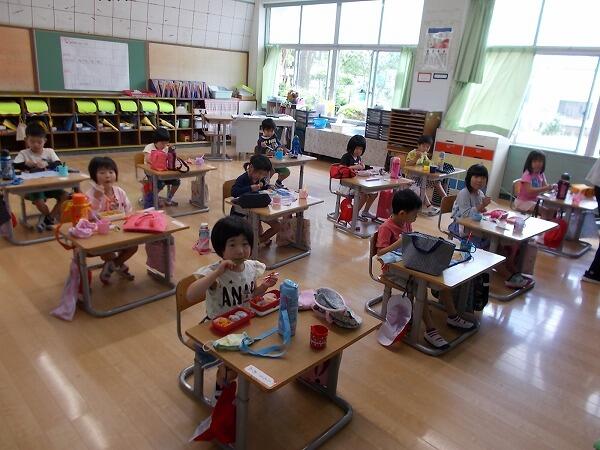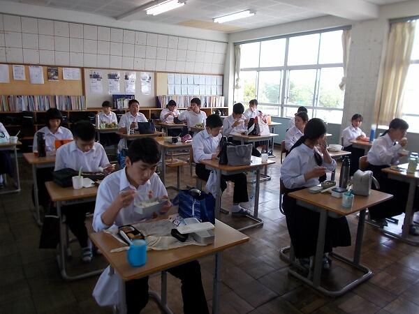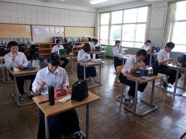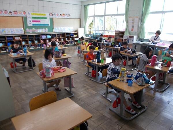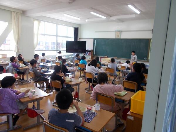今日は給食中の様子をご紹介します。普段はグループを作って食べているクラスが多いのですが、今は、前を向いて食べています。