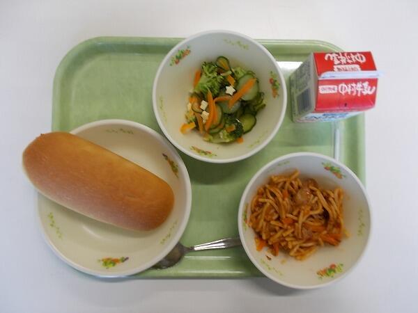 小学部の献立は「減量ミルクパン、ミートスパゲッティ、チーズサラダ」でした。