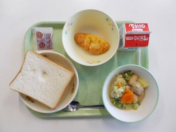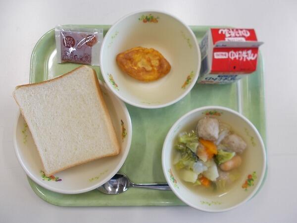 小学部の献立は「食パン、コンソメ煮、トマトオムレツ、イチゴジャム」でした。