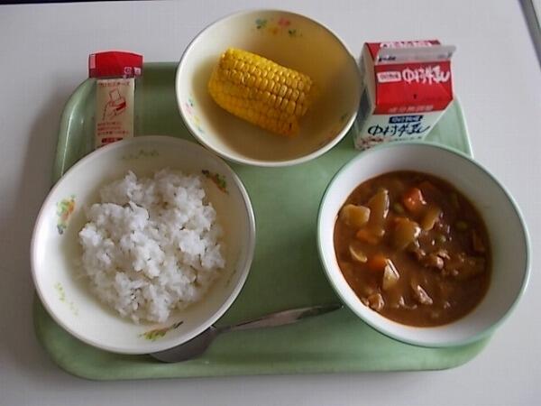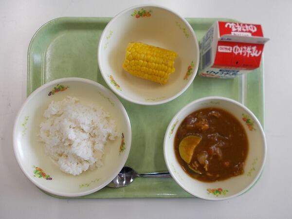 小学部の献立は「麦ご飯、ポークカレー、スイートコーン」でした。