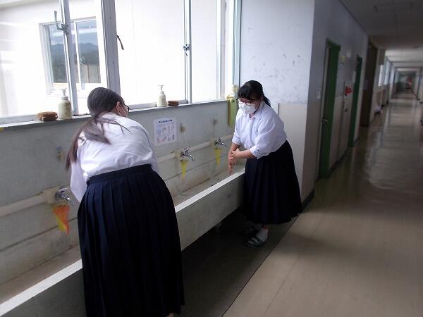 給食前にはきちんと手を洗います。間隔をあけて手を洗います。