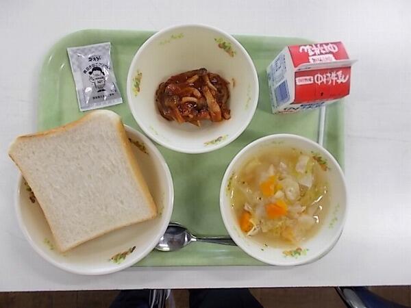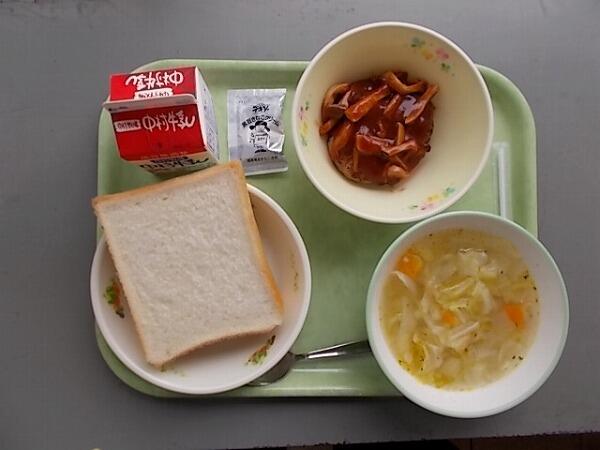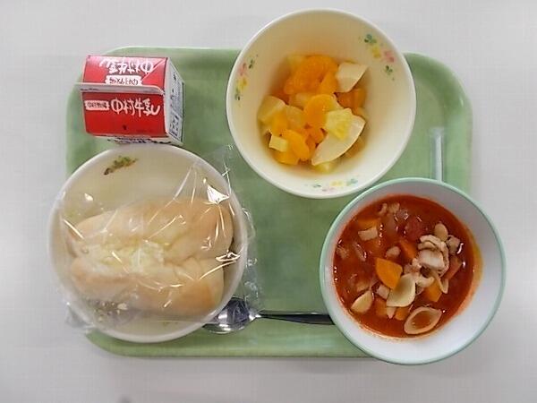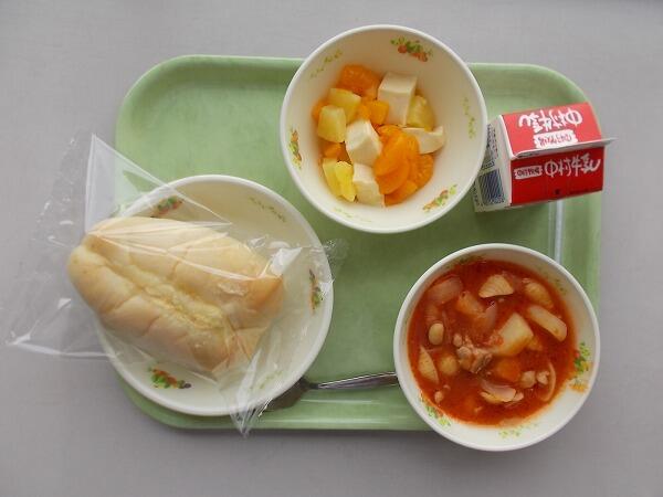 小学部の献立は「マヨネーズパン、ミネストローネ、豆乳プリン和え」でした。