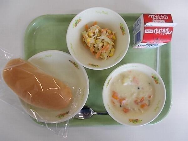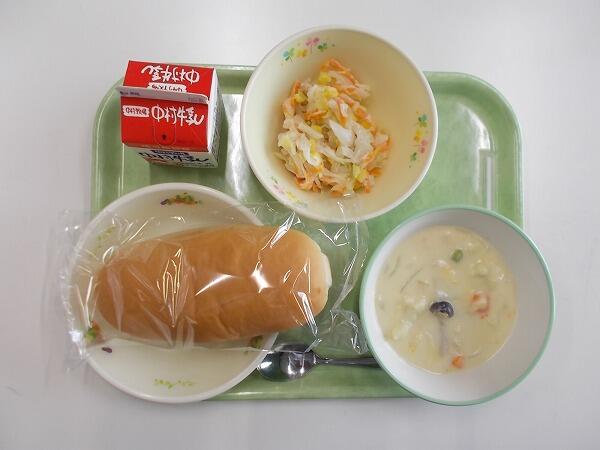 小学部の献立は「コッペパン、クリームシチュー、コールスロー」でした。