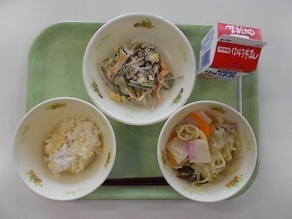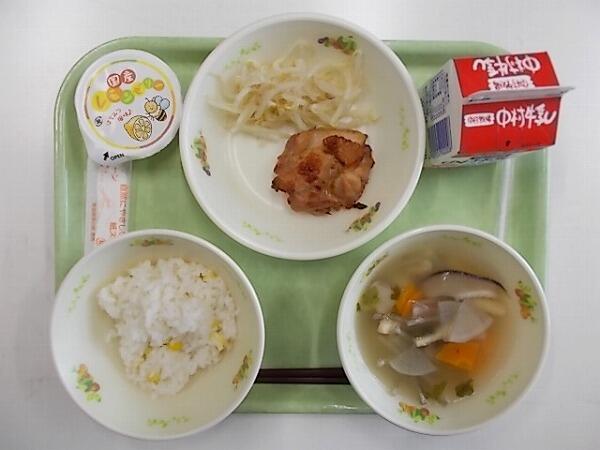小学部の献立はお楽しみ献立で「コーンご飯、白玉団子汁、鶏肉の照り焼き(ゆでもやし)、レモンゼリー」でした。
