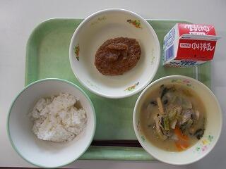 中学部の献立は「麦ごはん、豆乳汁、おろしハンバーグ」でした。