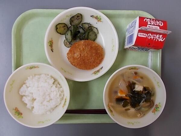中学部の献立は「麦ご飯、なめこの味噌汁、牛肉コロッケ、ゆかり和え」でした。