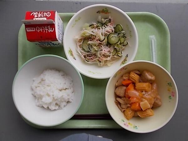 中学部の献立は「麦ご飯、肉団子の甘酢煮、華風サラダ」でした。