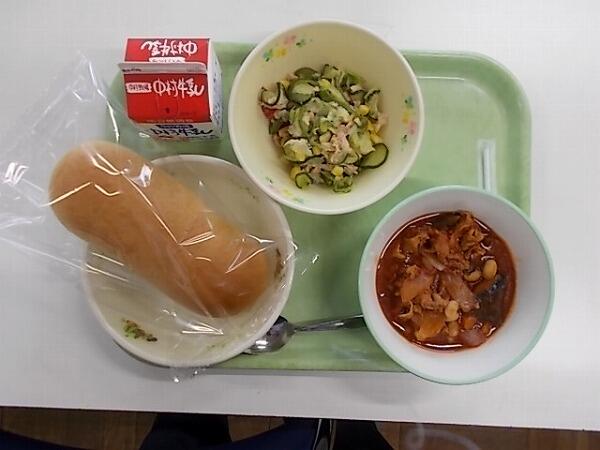 小学部の献立は「黒糖パン、豚肉のトマト煮、ピーマンサラダ(西都の日)」でした。