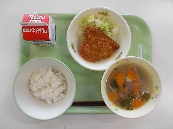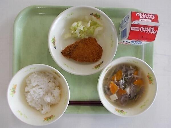 小学部の献立は「麦ご飯、みぞれ汁、鰹フライ、ゆでキャベツ」でした。