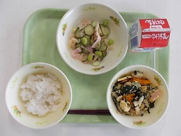小学部の献立は「麦ご飯、大豆のチリソース、ひじきと野菜のナムル」でした。