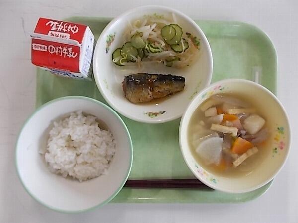 小学部の献立は「麦ごはん、いももちじる、いわしカボスレモンに、ゆでもやし」でした。