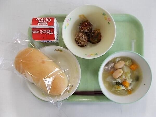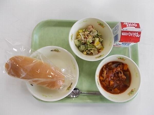 中学部の献立は「チーズパン、ポトフ、揚げたこ焼き(3個)」でした。