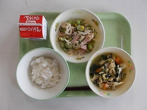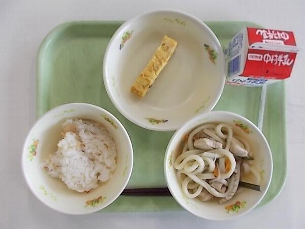 小学部の献立は「減量麦ご飯、うどん、野菜とツナの甘酢和え」でした。