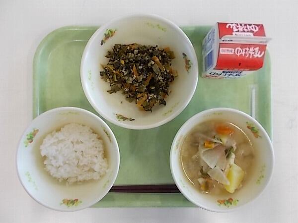 小学部の献立は「麦ご飯、さつま汁、高菜の油炒め」でした。