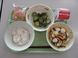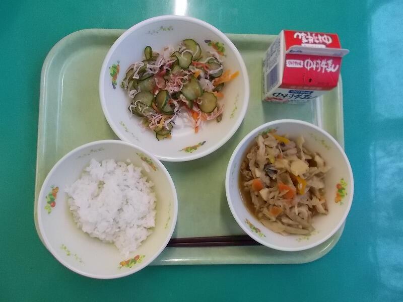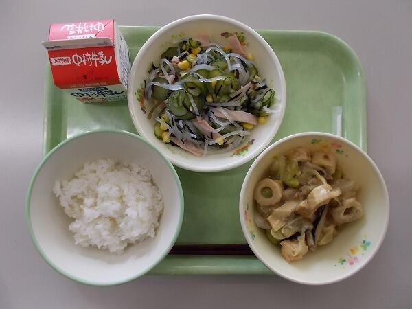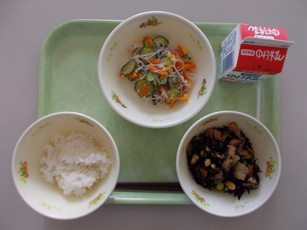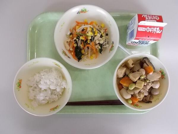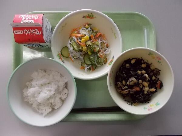 小学部の献立は「麦ご飯、大豆の磯煮、春雨の酢の物」でした。