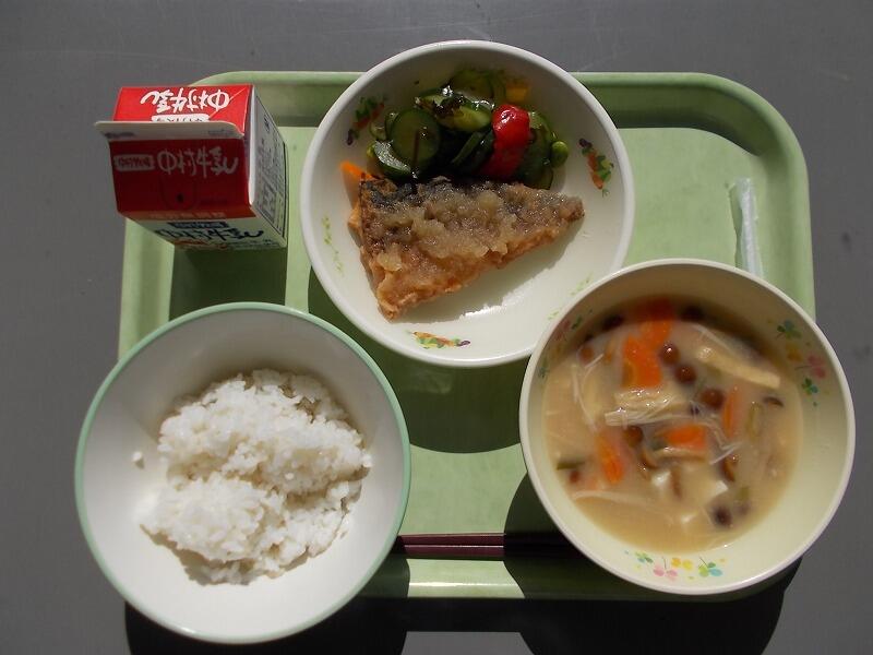 小学部の献立は「麦ご飯、きのこのみそしる、揚げ魚のおろしがけ、塩昆布和え」でした。