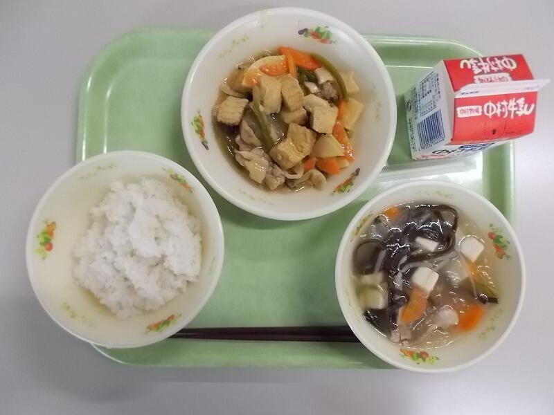 小学部の献立は「麦ごはん、中華スープ、厚揚げのオイスターソース炒め」でした。