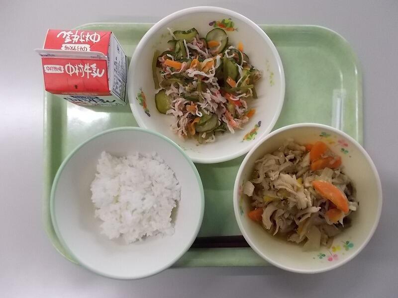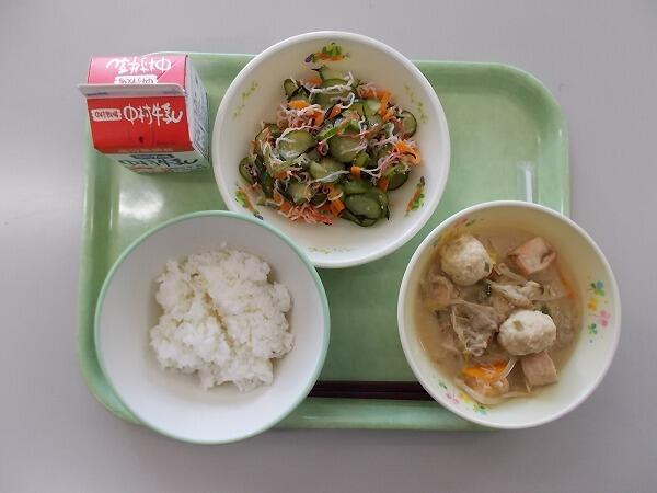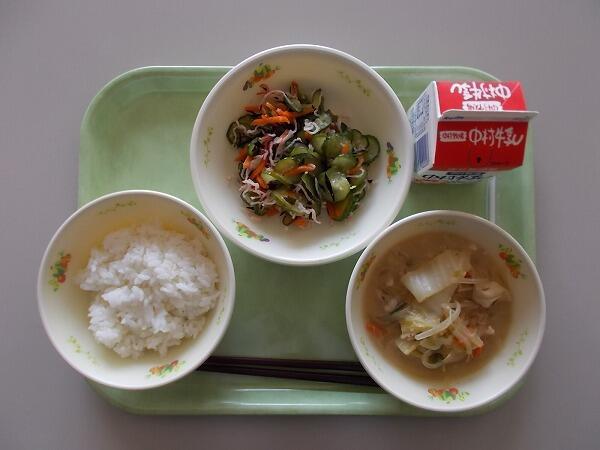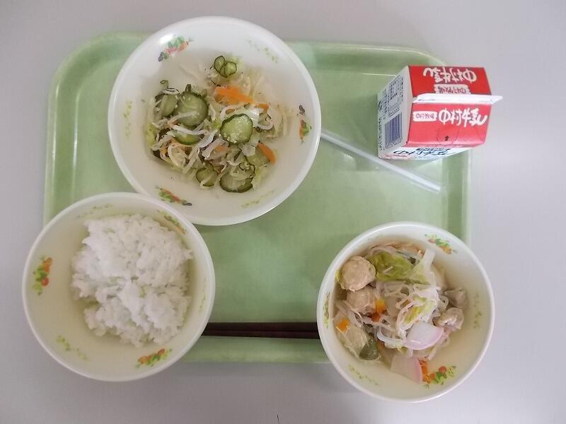 小学部の献立は「麦ご飯、ちゃんこ鍋、きゅうりの酢の物」でした。