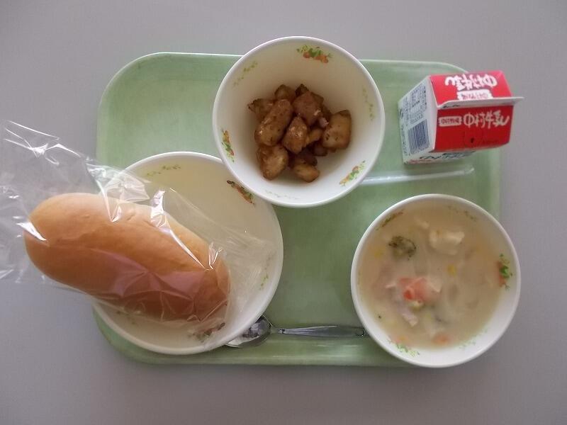 中学部の献立は「ミルクパン、豆乳のポタージュ、フカのレモン揚げ」でした。