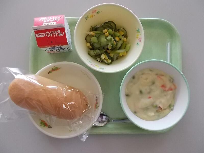 中学部の献立は「コッペパン、サツマイモのシチュー、グリーンサラダ」でした。
