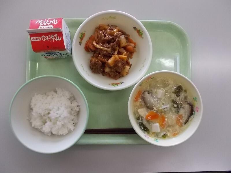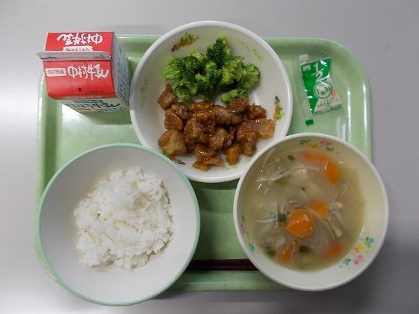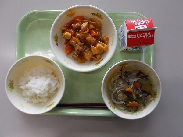 小学部の献立は「麦ご飯、中華スープ、酢豚」でした。