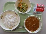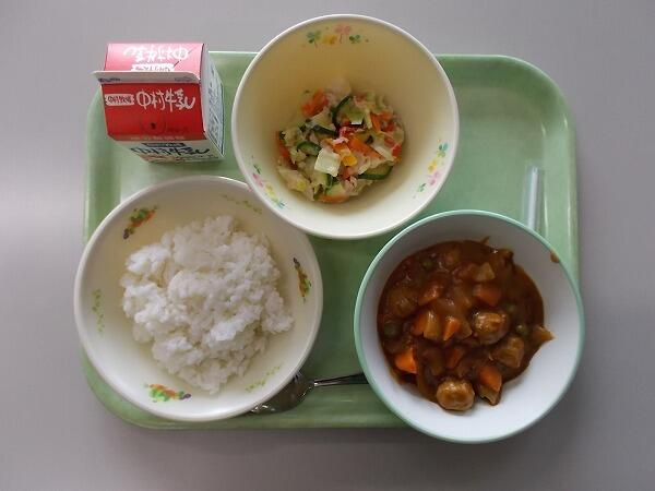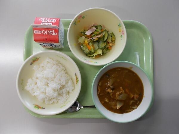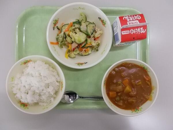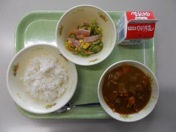 小学部の献立は「麦ごはん、ポークカレー、フレンチサラダ」でした。