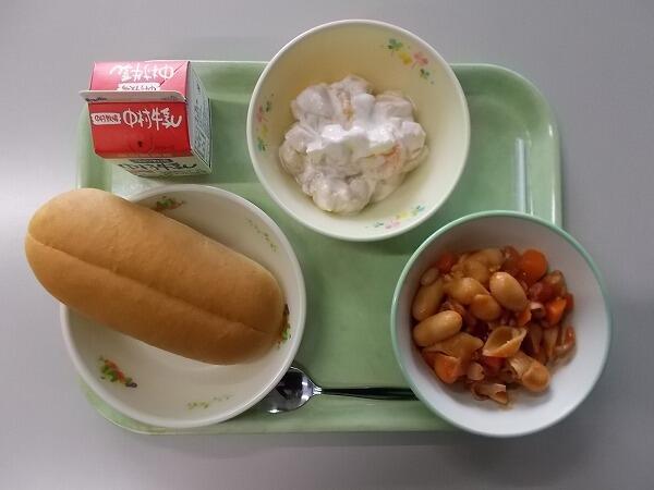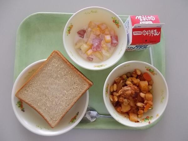 小学部の献立は「黒糖パン、ポークビーンズ、フルーツのヨーグルト和え」でした。