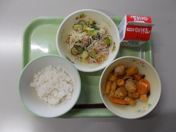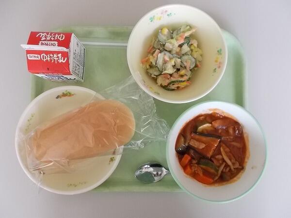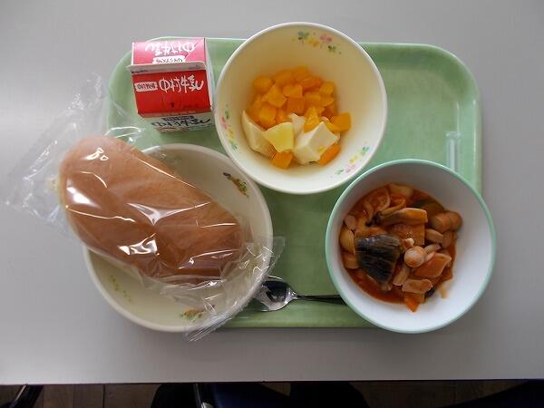 小学部の献立は「コッペパン、鶏肉と野菜のトマト煮、野菜のマヨネーズサラダ」でした。