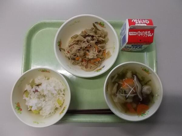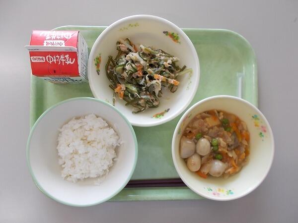 小学部の献立は「麦ご飯、うま煮、ちぐさあえ」でした。