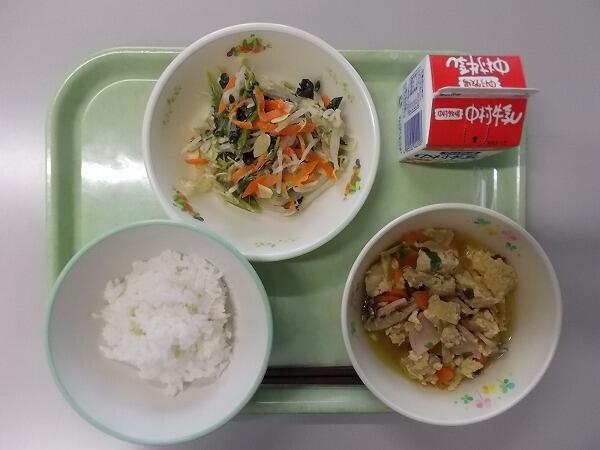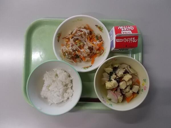 小学部の献立は「麦ご飯、入り豆腐、カルシウムたっぷりサラダ」でした。