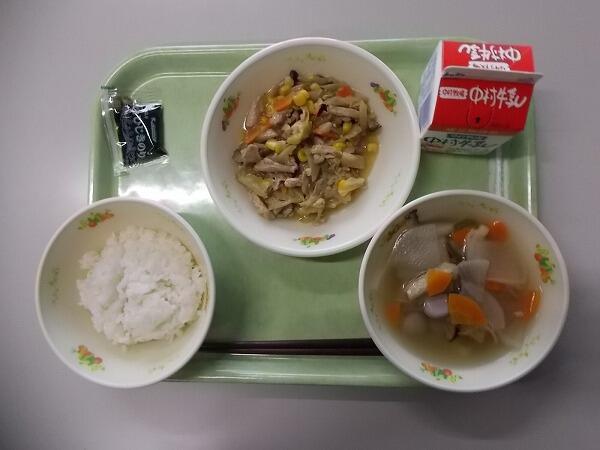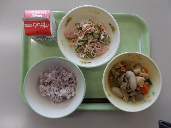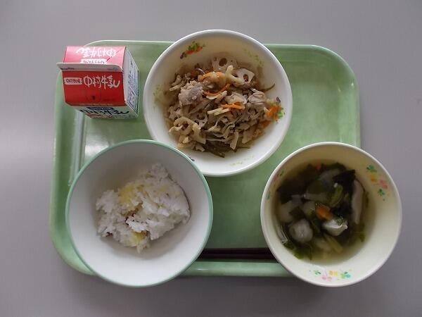 小学部の献立は「さつまいもご飯、じゃこだんごじる、れんこんきんぴら」でした。