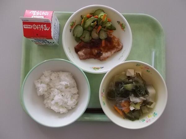 小学部の献立はリクエスト献立で「減量麦ごはん、もずくスープ、彩り野菜のメンチカツ(添えきゅうり)、チョコタルト」でした。