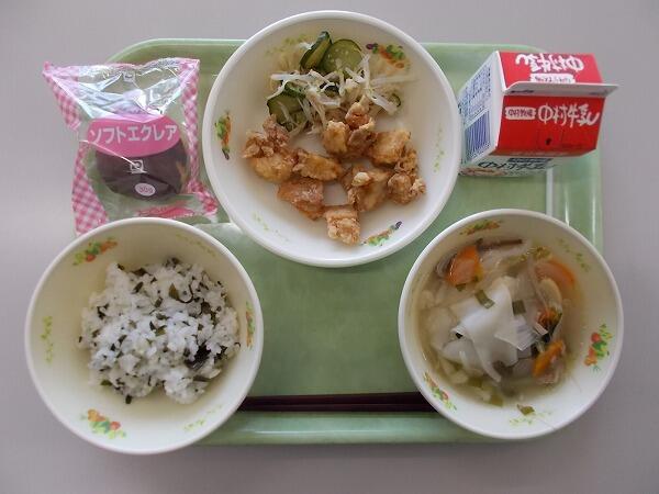 小学部の献立はリクエスト献立で「茎わかめご飯、ワンタンスープ、鶏肉から揚げ(ナムル)、エクレア」でした。