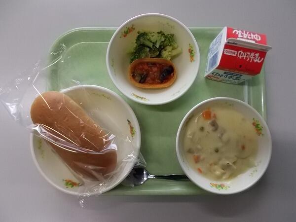 小学部の献立は「減量黒糖パン、クラムチャウダー、トマトグラタン、ブロッコリー」でした。