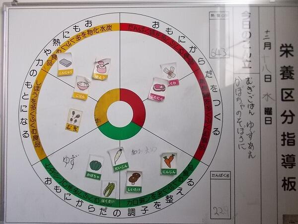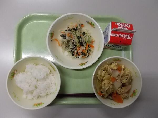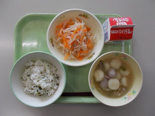 小学部の献立は「大根ご飯、具雑煮、紅白なます」でした。