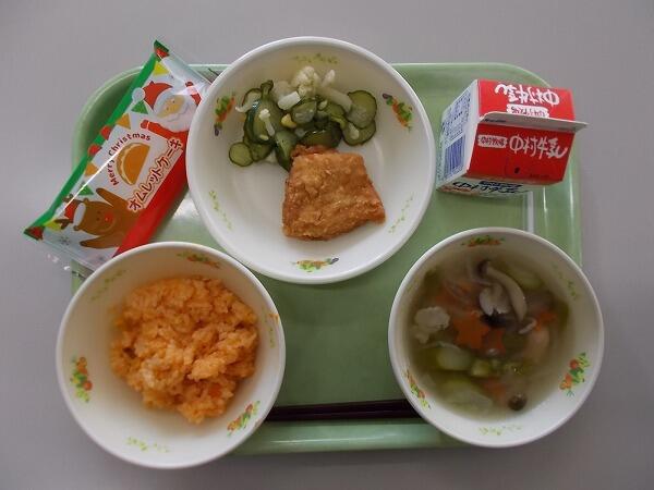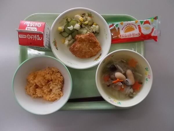小学部の献立は「減量チキンライス、野菜スープ、フライドチキン(ミニサラダ)、オムレットケーキ」でした。